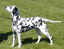 Rasse: Dalmatiner Herkunft: Einige Abbildungen dieser Rasse wurden auf ägyptischen Basreliefs und griechischen Fresken gefunden. Es handelt sich also um eine sehr alte Rasse. Körperbau: Es handelt sich um einen muskulösen Hund mit symmetrischem Körperbau, einer Schulterhöhe zwischen 54 und 61 cm und einem Gewicht von 24 bis 27 kg. Der Kopf ist etwas länglich, und er hat einen kräftigen Fang. Je nach Fellfarbe ist der Nasenspiegel schwarz oder braun. Die schwarzen oder braunen Augen sind rundlich, glänzend und haben einen intelligenten Ausdruck. Er trägt einen feinen anliegenden Behang. Seine leicht nach oben gebogene Rute ist breit angesetzt und verjüngt sich. Das Haar des Dalmatiners ist kurz, hart, dicht und glänzend. Die Grundfarbe ist immer reinweiß und ungeordnet mit schwarzen und leberfarbenen Flecken bedeckt. Bei der Geburt sind die Welpen reinweiß. Wesen: Der Dalmatiner ist heiter, treu, unabhängig, aber leicht erziehbar und äußerst empfindsam. Er braucht die Gesellschaft des Menschen, sonst wird er melancholisch. Er spielt gern, ist kinderlieb, besitzt ein ausgezeichnetes Gedächtnis und vergißt auch nach Jahren kein ihm zugefügtes Unrecht. Verwendung: Aufgund seiner Ausdauer wurde er ursprünglich als Laufhund verwendet. Heute ist er ein angenehmer Begleit- und Wachhund, der viel Bewegung braucht. Er ist sauber und ordentlich. |