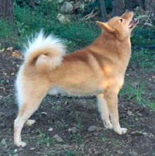 Rasse: Finnenspitz Herkunft: Er wird seit Jahrhunderten in Finnland gezüchtet. Sein erster Standard stammt aus dem Jahre 1812. Körperbau: Er ist ein Hund mit angenehmer Erscheinung und stolzer Haltung. Er hat einen spitzen Fang, Stehohren, einen rötlichen Mantel, der wie eine Mischung von Wolfspelz und Chow-Chow-Behaarung wirkt. Die Schulterhöhe beträgt 40 bis 50 cm. Der Hals ist muskulös und kurz, die Brust tief, der Bauch eingezogen. Der Hund sollte lebhafte, möglichst dunkle Augen und eine über den Rücken gerollte Rute haben. Das Deckhaar liegt über dunkler Unterwolle an. Man findet den Hund in den Farben rotbraun (fuchsig) oder gelbrot, weiße Abzeichen an Brust und Pfoten sind erlaubt. Wesen: Er ist treu, freundlich und mutig. Verwendung: Die Lappen brauchten ihn einst, um Weißbär und Elch zu jagen. Später wurde er für die Jagd auf Birk- und Auerwild eingesetzt. Der Finnenspitz ist aber auch ein ausgezeichneter Wachhund. |