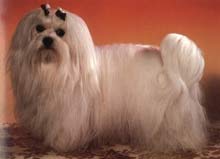 Rasse: Malteser Herkunft: Er kommt aus Italien und wurde bereits im Mittelalter aus Kreuzungen zwischen Zwergspaniels und Zwergpudeln gezüchtet. Körperbau: Die Widerristhöhe sollte 20 bis 25 cm und das Gewicht von 3 bis 4 kg betragen. Der Kopf ist kurz mit spitzer Schnauze, die Augen sind dunkel und knopfförmig, die Ohren sind hängend mit langem Haar und die Rute wird über den Rücken gerollt getragen. Das Haarkleid ist dicht, lang und glänzend. Er kommt nur in reinweiß vor. Wesen: Er ist intelligent, gehorsam, ruhig, kinderlieb und in seinen Herren verliebt. Bemerkung: Sein Haarkleid benötigt tägliche Pflege. Verwendung: Er wird als Begleithund gehalten. |