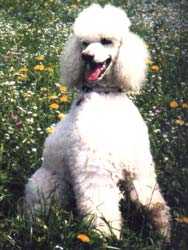 Rasse: Pudel Herkunft: Seine Abstammung geht auf den fast ausgestorbenen französischen Wasserhund (Barbet) zurück. Körperbau: Anerkannt sind drei Schläge: der Großpudel (Königspudel) mit einer Schulterhöhe von 45 bis 55 cm (max. 60 cm), der Mittelpudel, mit einer Schulterhöhe von 35 bis 45 cm und der Zwergpudel, mit einer Schulterhöhe bis zu 35 cm. Das Gewicht dieser drei Schläge beträgt respektive ca. 22, 12 und 7 kg. Der Kopf des Pudels ist elegant, geradlinig und wohlproportioniert. Die Nase ist schwarz bei schwarzen, grauen oder weißen Tieren, aber braun bei braunen Tieren. Seine Wangen sind flach, und er trägt ein Scherengebiss. Der Fellfarbe angepasst, hat er schwarze oder braune Augen mit sehr lebhaftem, intelligentem Ausdruck. Sein anliegender Behang ist reich behaart. Die stark behaarte Rute ist hoch angesetzt und wird um die Hälfte oder auf ein Drittel kupiert. Das Haar formt Locken oder Schnüre. Er kommt immer einfarbig schwarz, weiß, kastanienbraun, crème und silbergrau vor. Bei den Zwergpudeln sieht man auch apricotfarbene oder blaue Tiere. Wesen: Der Pudel ist grundsätzlich gutmütig, sehr intelligent, kühn, fröhlich, empfindsam und sehr gelehrig. Er spielt liebend gern mit Kindern. Er hat ein sehr gutes Gehör und einen ausgeprägten Orientierungssinn. Schnell erfasst er den Sinn von Wörten. Bemerkung: Das Haar des Pudels muss regelmäßig geschoren werden. Verwendung: Ursprünglich galt er als Apportierhund für Wassergeflügel. Seine Bringfreude und große Wasserpassion hat er von seinem Vorfahren (Barbet) geerbt. Seine sympathischen Wesensmerkmale und seine Schönheit haben ihn schnell zum Begleithund werden lassen. |